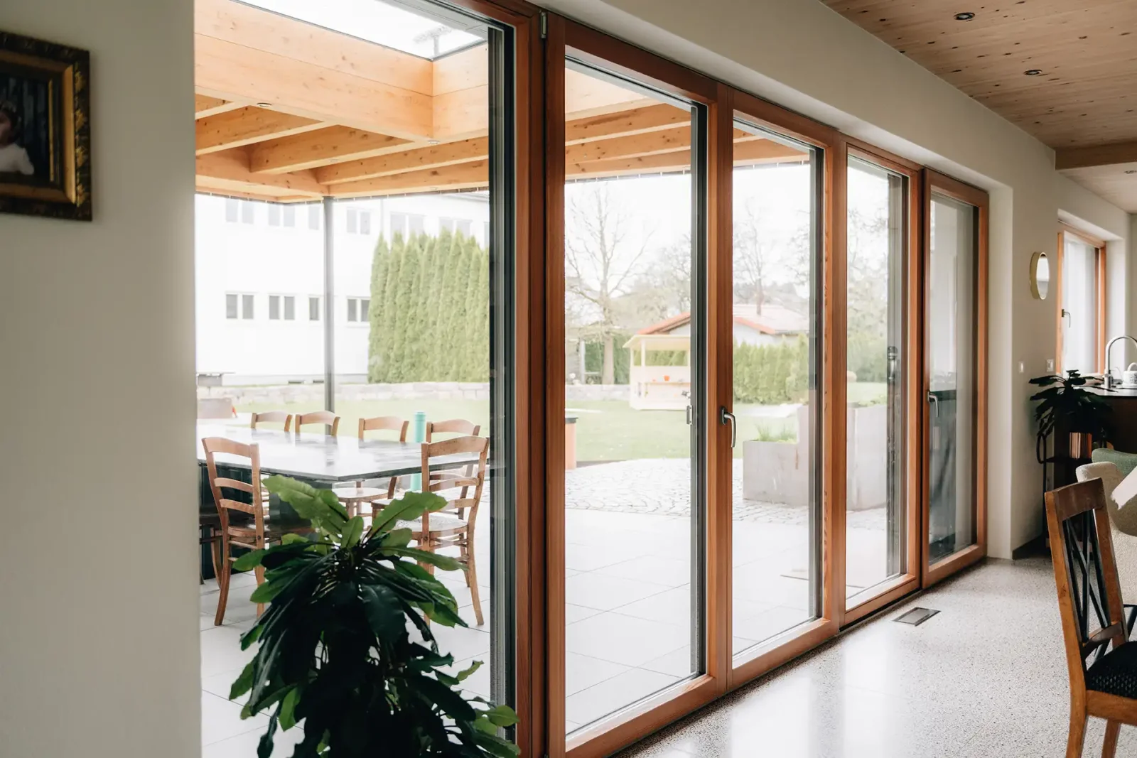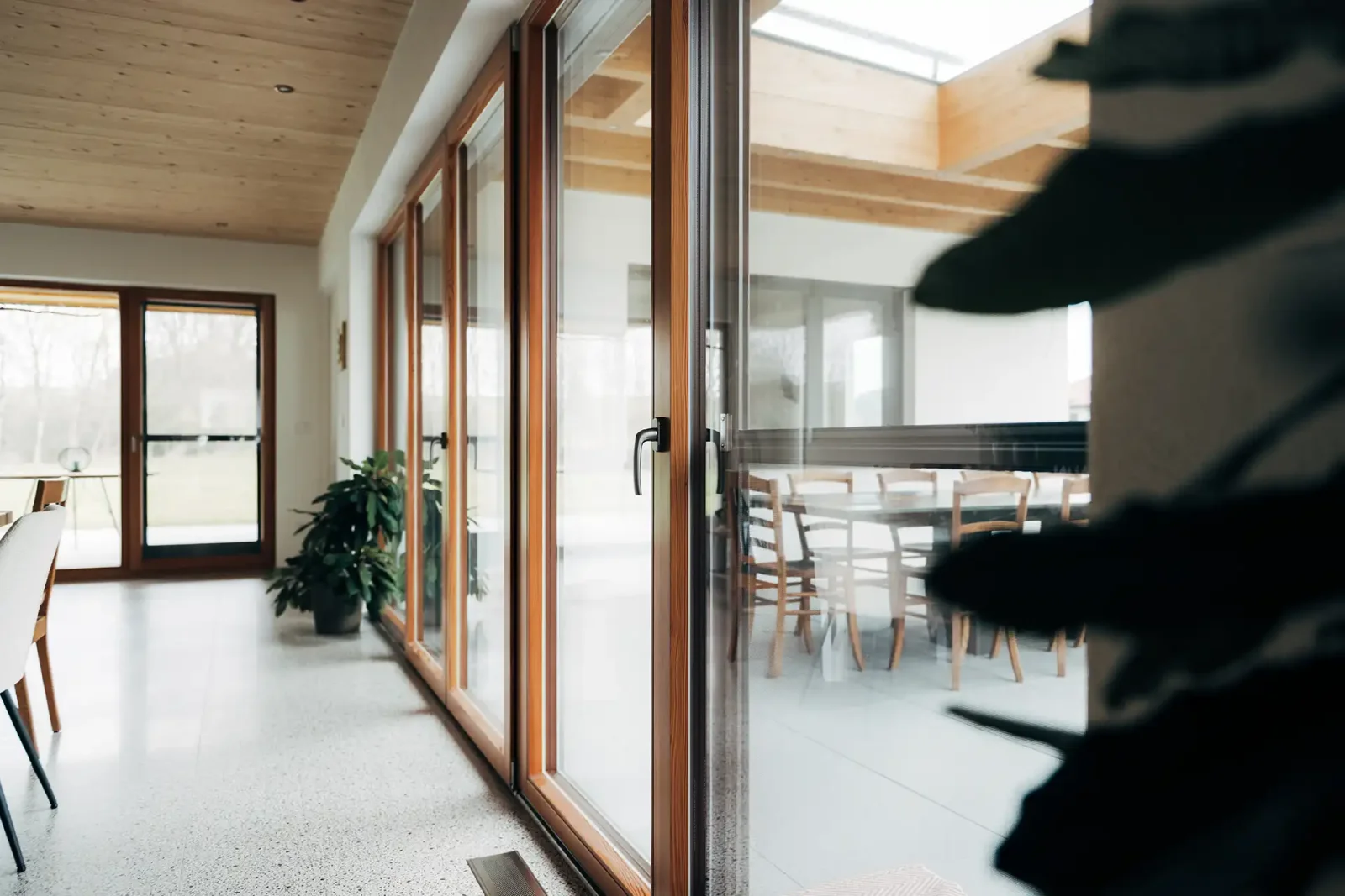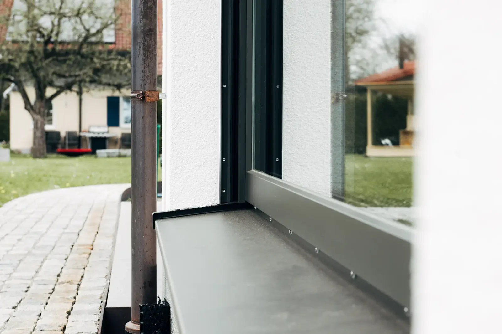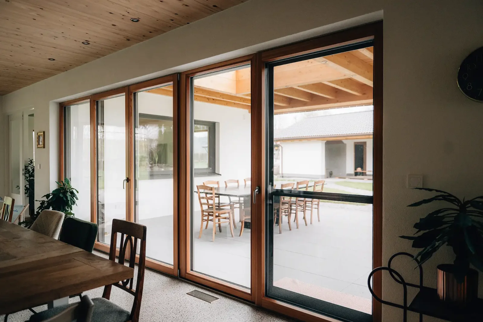 Zum Einsatz kamen elegante Holz-Aluminium-Fenster, ein großes Sitz-/Panoramafenster, durchdachte Beschattungslösungen sowie passgenauer Insektenschutz. Ein besonderes Highlight war die über fünf Meter breite Hebe-Schiebe-Tür, die großzügig Tageslicht in den Wohnraum bringt und gleichzeitig höchste technische Ansprüche erfüllt.